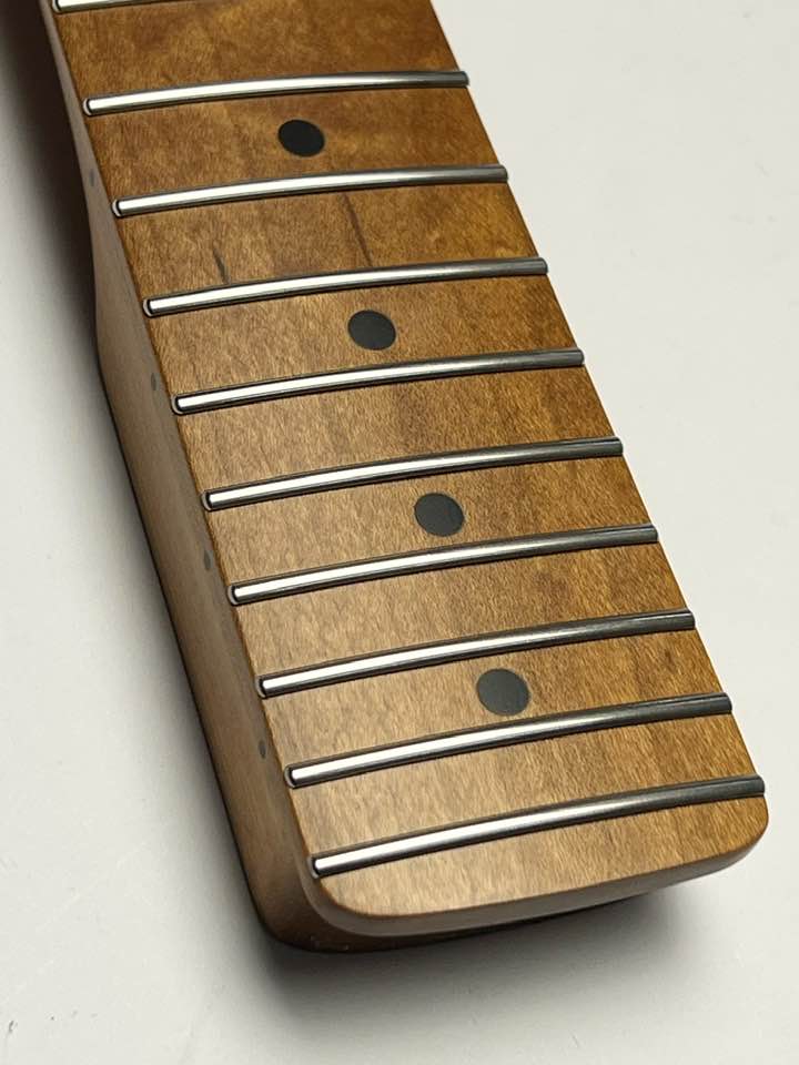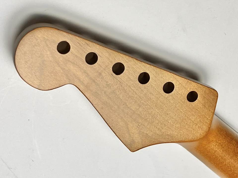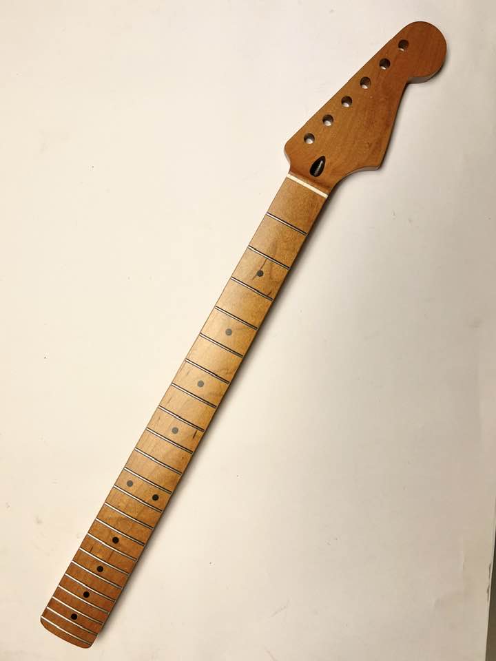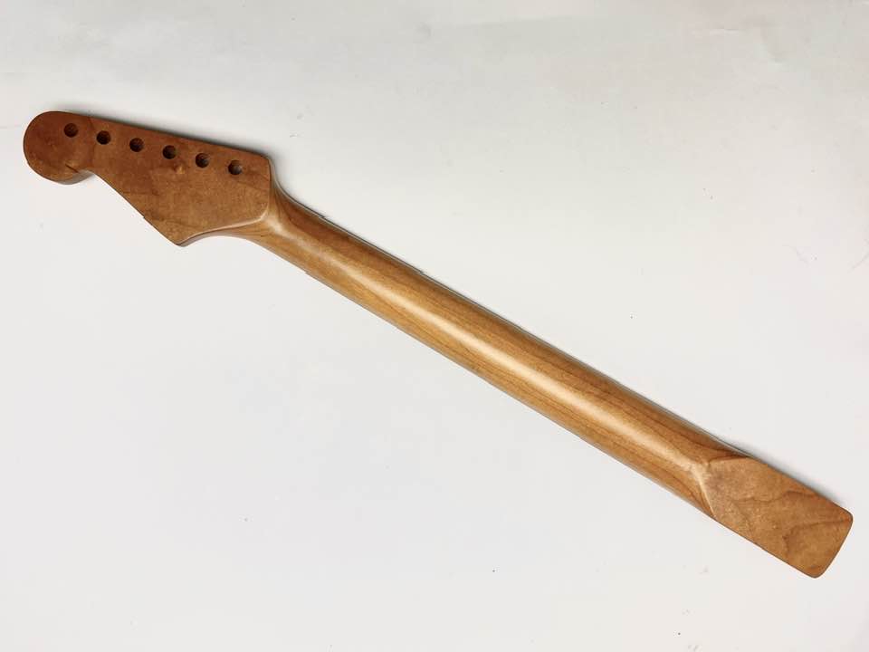 Maple Neck for S guitar Neck: Maple Finish: Satin Nitro Fretboard: Maple w/black dots Frets: 22, Medium Jumbo. Nickel/Copper Alloy Radius: 9.5″ Shape: C Scale: 25 1/2″ Tuner Holes 10 mm. Nut Width: 42 mm Trussrod: Dual Action