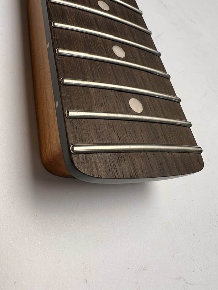 Rosewood Neck for S guitar Neck: Roasted Maple Finish: Satin Nitro Fretboard: Rosewood w/white dots Frets: 22, Medium Jumbo. Nickel/Copper Alloy Radius: 9.5″ Shape: C Scale: 25 1/2″ Tuner holes 10 mm Nut Width: 42 mm. Trussrod: Dual Action